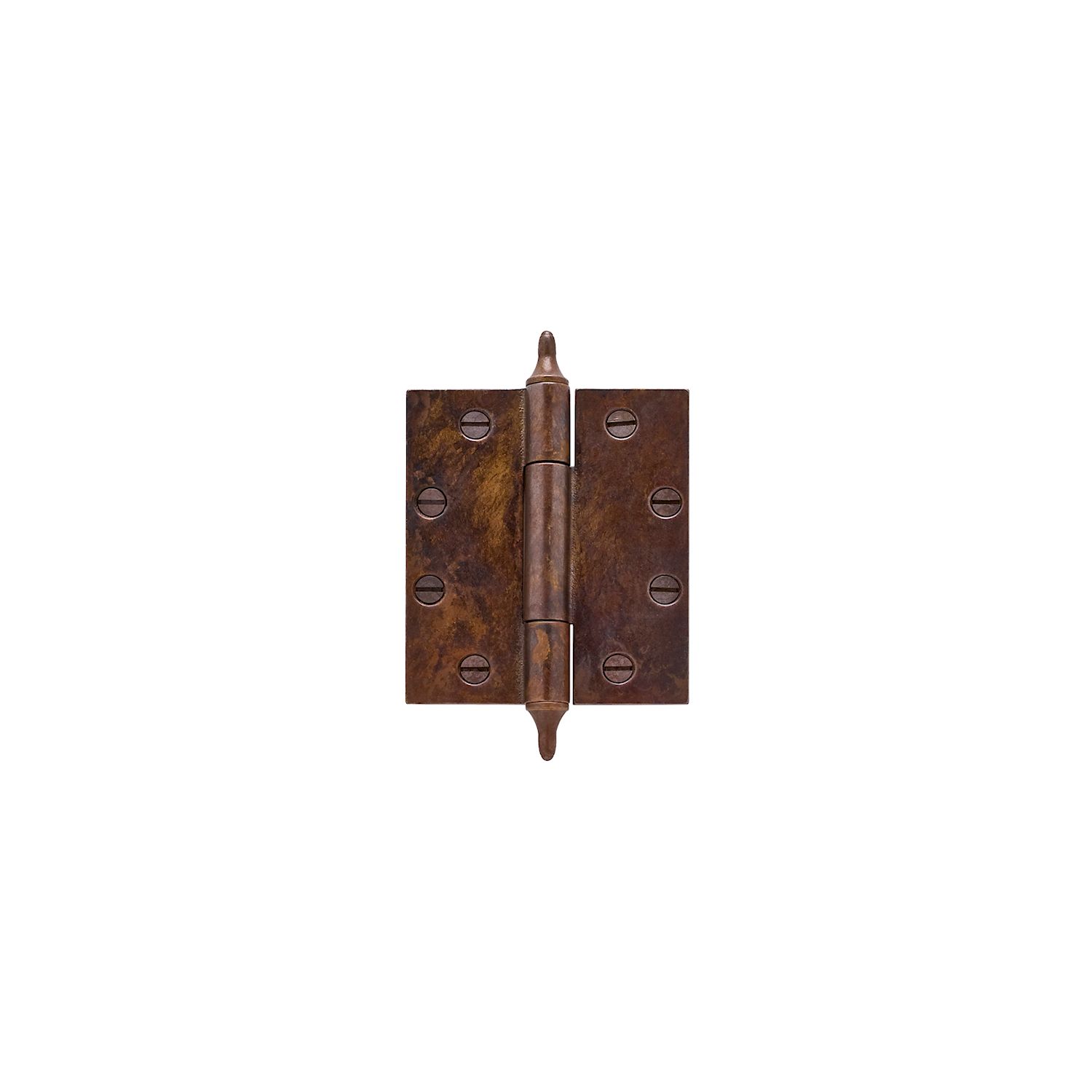 5" x 5" concealed bearing hinge (HNG4.5x4A) with the Steeple finial cap, shown in silicon bronze, brushed patina.